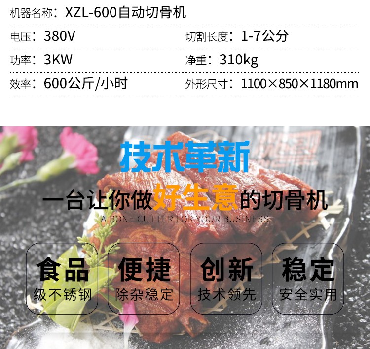 XZL-600自動切骨機適用于小型食品加工廠、屠宰場、肉類加工廠、超市等單位使用。適用于中小型動物骨頭,排骨,冷凍肉,凍雞、凍魚、鮮骨頭、鮮肉等加工設備。切骨機接觸食品的部位及外觀部位均采用不銹鋼或耐腐蝕材料制造,符合食品衛(wèi)生要求。本機設計合理,清洗方便,無損耗,采用特殊刀具切骨,不產生碎骨,較大程度保護了您的利益,且全自動送料,操作簡單,大大的減輕工人勞動強度,提高了安全系數(shù)。不易會傷到手,具有效率高,能耗低,操作安全,外形美觀等特點。