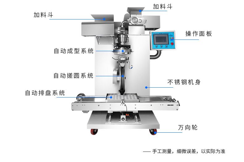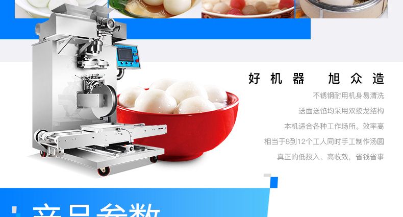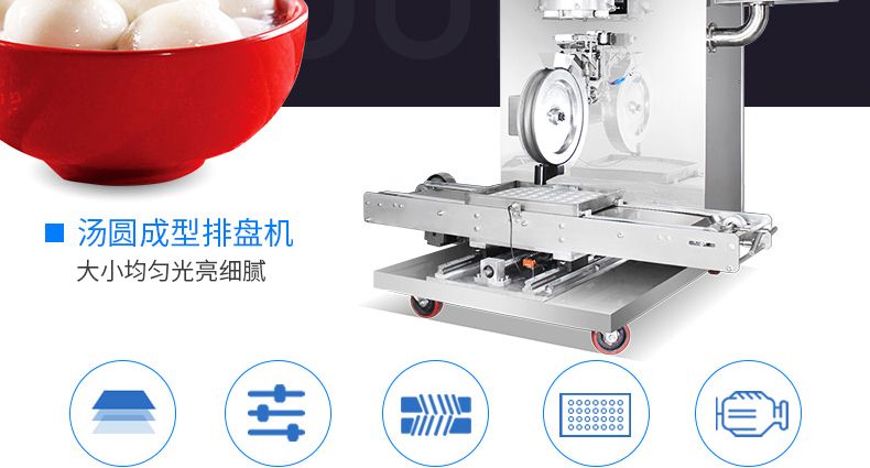 ◆自動化程度高,只要將面團與餡料放入進料口,開機便可自動搓圓成型,制品不易變形,定量準(zhǔn)確;